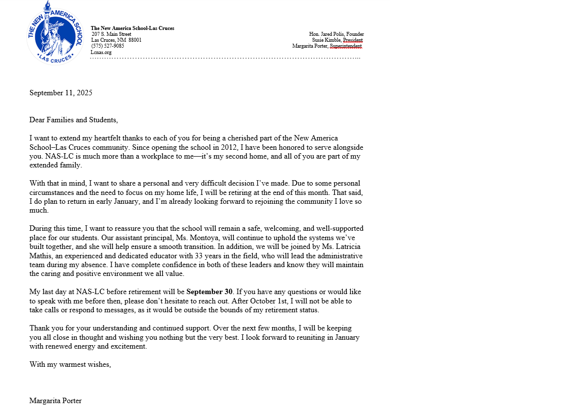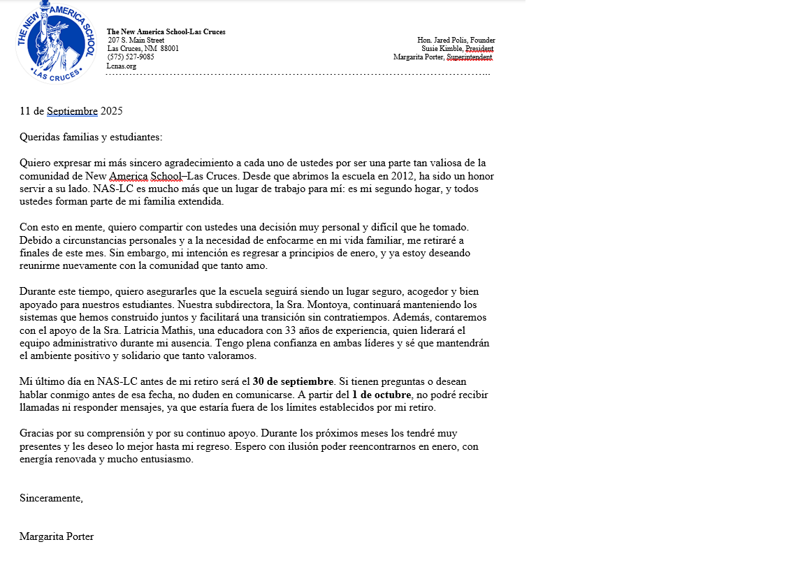27 de enero de 2025 Estimadas familias de New America School-Las Cruces, La semana pasada, se inició una Orden Ejecutiva que afectó las pólizas federales de la ley de inmigración en nuestro país. Sabemos que esto puede haber causado preocupación a nuestras familias. Estamos monitoreando la situación y estamos en comunicación con nuestra abogada para obtener orientación. Todos los estudiantes, independientemente de su estatus migratorio, son bienvenidos en NAS-LC. Los niños de Nuevo México tienen derecho a una educación pública gratuita. NAS-LC no colecciona el estatus migratorio de los estudiantes o sus familiares. Si nos piden esta información, no la tenemos. NAS-LC no se pondrá en contacto con ninguna agencia para proporcionar el estado migratorio. No somos responsables de hacer cumplir la ley federal de inmigración. Para recibir más información, es importante que la escuela tenga sus números de contacto correctos en el archivo. La Escuela envía mensajes de texto con información. Nuestra escuela tiene una trabajadora social en el campo escolar. Ella esta al tanto de los estudiantes si se sienten nerviosos o estresados por el cambio en las pólizas de la nación. La salud mental y la seguridad de nuestros estudiantes es nuestra prioridad. Si tiene alguna pregunta, no dude en ponerse en contacto conmigo. Si desea leer más sobre este tema, la oficina del Procurador General de Nuevo México publicó este documento: Garantizar un entorno de aprendizaje seguro para todos: Guía para ayudar a las escuelas K-12 de Nuevo México en respuesta a problemas de inmigración.( Guia para ayudar las escuelas K-12 de Nuevo México en respuesta a problemas de inmigración .